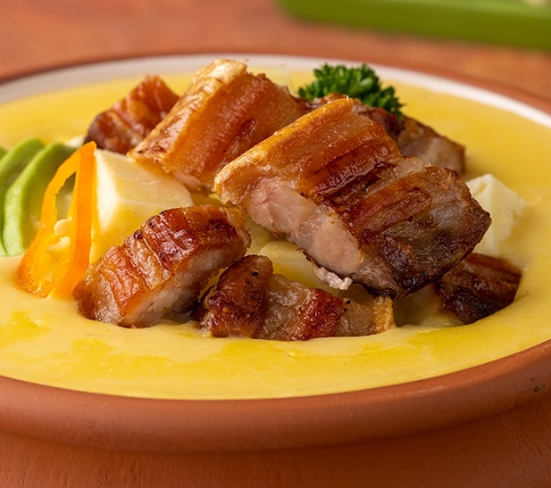 - Incorpore la leche, queso y sirva acompañado de aguacate y el chicharrón crocante